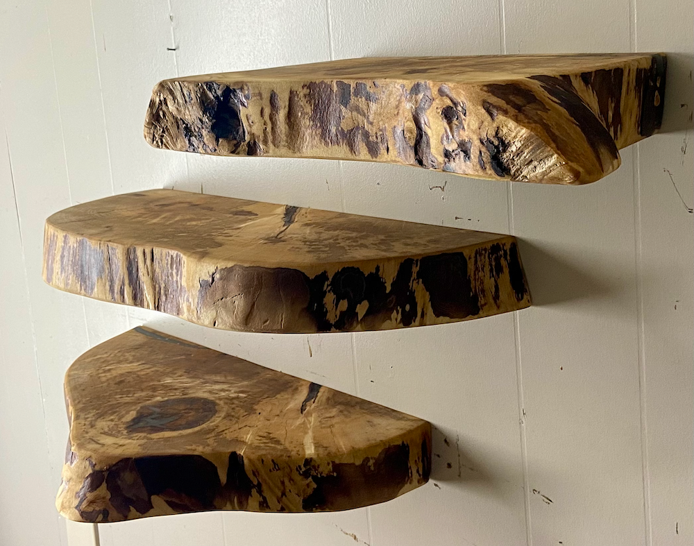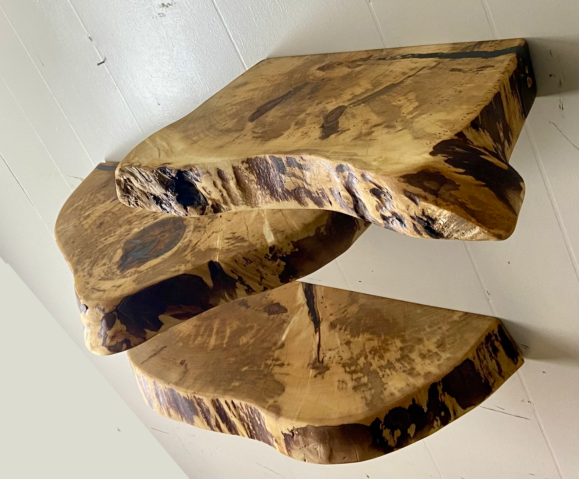Very unique set of floating shelves created from round cross-cut live edge maple.